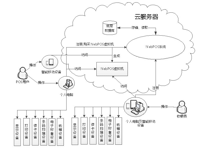 卓安科技WebPOS結構圖- 1、采用云服務器以及SaaS(Software as a Service)設計架構,POS用戶能夠直接從網上注冊登錄使用WebPOS服務;
